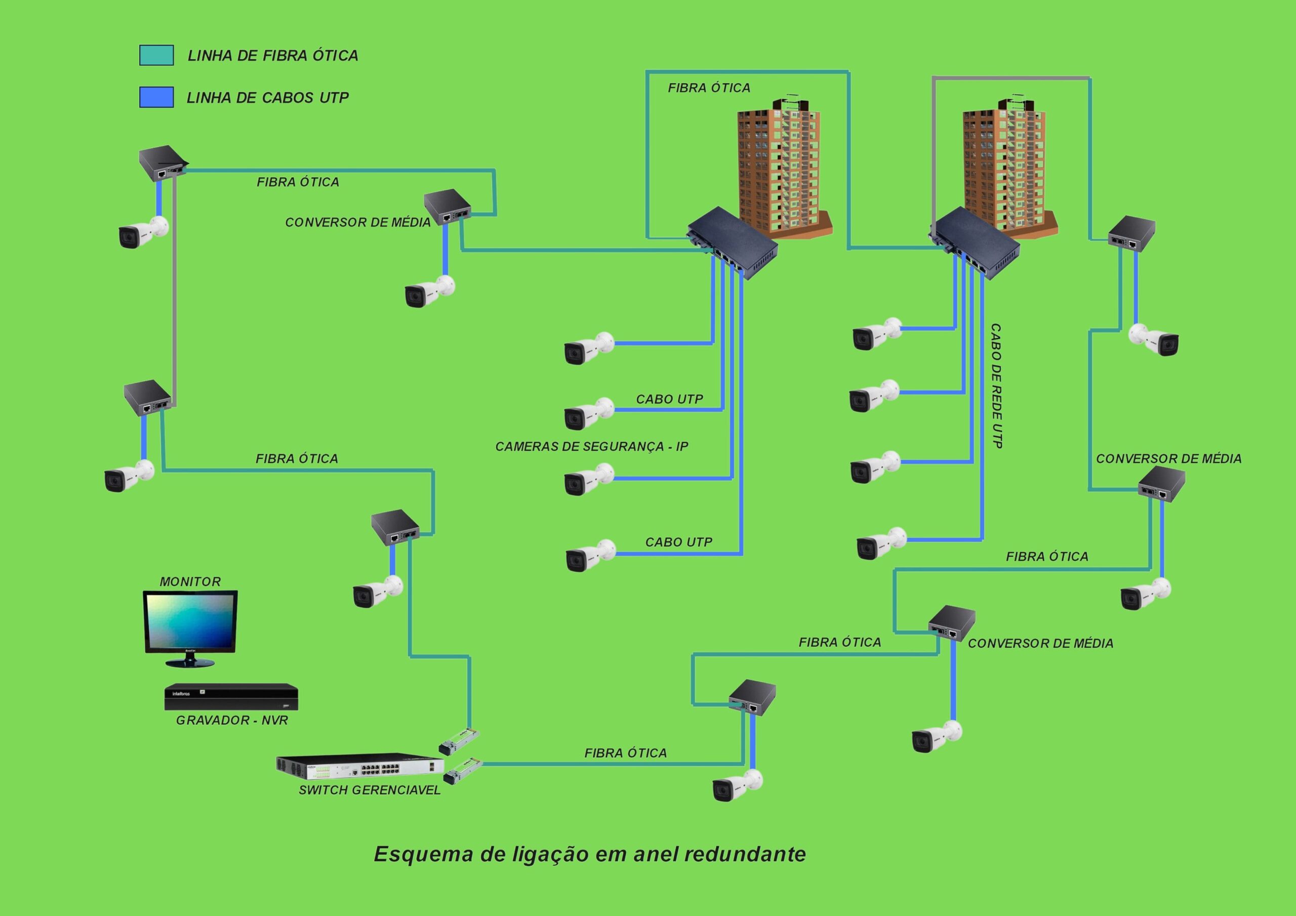 A segurança do seu prédio, condomínio e empresa é uma prioridade. Uma das melhores maneiras de garantir essa segurança é através da instalação de câmeras. Contudo, ao utilizar a tecnologia de fibra óptica, o processo de instalação pode parecer complexo. Este diagrama de um projeto de fibra ótica nos garante que se em qualquer lugar deste circuito se um cabo for interrompido o sistema continuara funcionando.